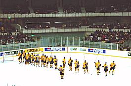 この日の試合は、日本アイスホッケーリーグの「コクドVS雪印」のです。 ビッグハットでは今シーズン日本アイスホッケーリーグが、長野スーパーウィーク銘打って4試合行わたのですが、これはそのうちの一試合です。今年もアイスホッケー人気は高く、この日はビッグハットが満席になりました。