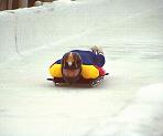 スタートはボブスレーと同じようにそりを押して走ってから飛び乗ります。