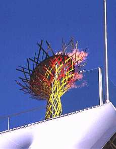 - 快晴の真っ青な空をバックに赤々と燃える聖火は美しかった。