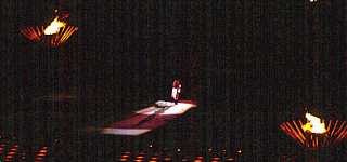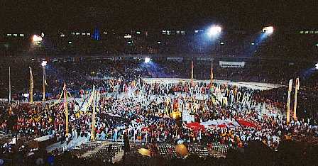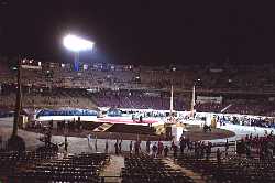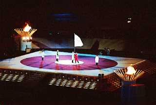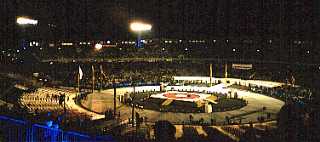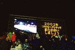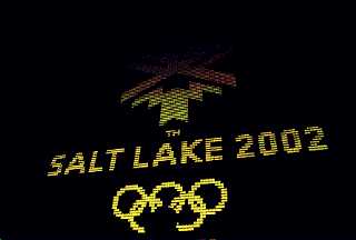- うしろの大型スクリーンは、SALT LAKE 2002 のマークと文字です。