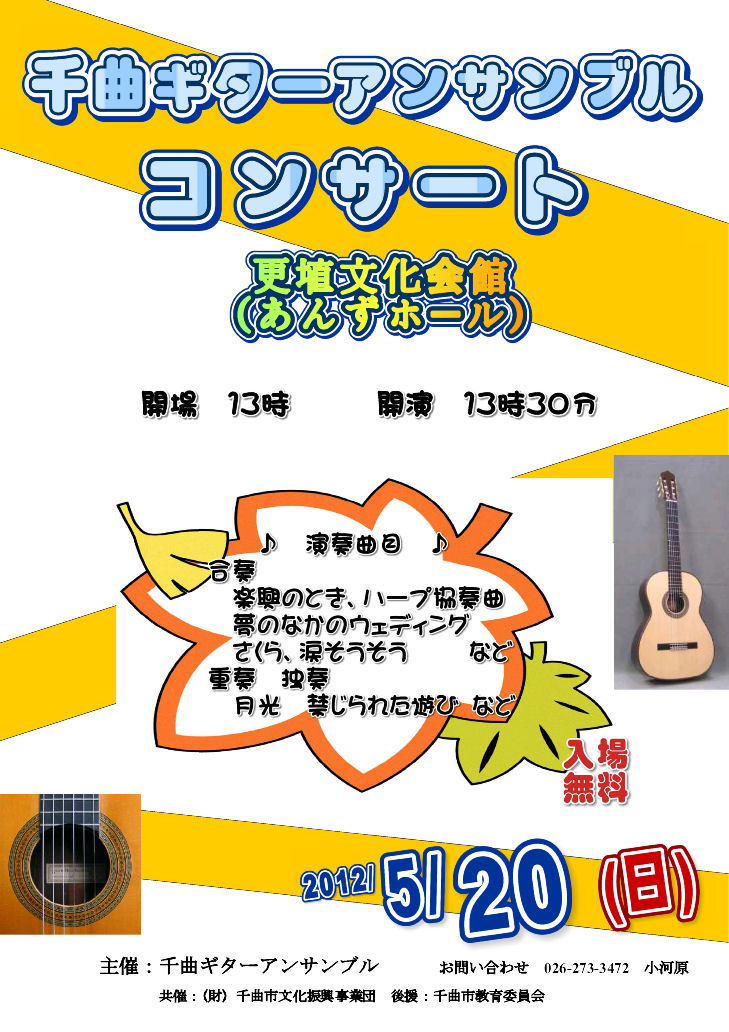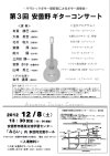 <演 奏> 有賀 勝巳 (長野市) 大森 英世 (長野市) 北村 和久 (長野市) 斎藤 厚 (茅野市) 前川 陽 (松本市) 三井田 勝一 (池田町) 宮澤 きく子 (安曇野市) 山崎 秀之 (千曲市) <ゲスト出演> 岩村 通康 (長野市) <主なプログラム> セビーリャ…I.アルベニス 木漏れ日の中で…辻 幹雄 朱色の塔…I.アルベニス アデリータ…F.タレガ ミロンガ…J.カルド-ソ ラブ・ワルツ…U.ノイマン アラビア風奇想曲…F.タレガ ソナタハ長調より第1楽章…M.ジュリアーニ マジョルカ …I.アルベニス など
